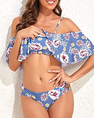 Elevate your beachwear with this charming ruffle bikini for women, featuring a grey floral off-shoulder flounce top and sexy hipster bottom with side cutouts.