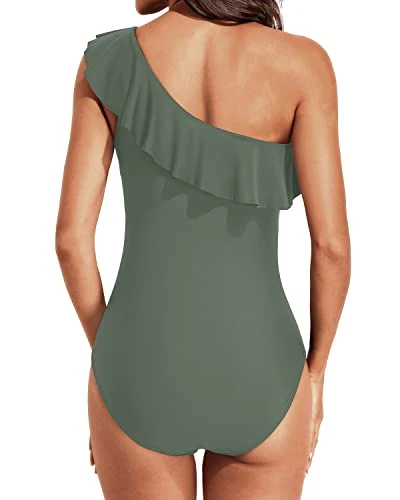 Make a statement in this Women One Piece Swimsuit, featuring a flattering front ruched design, one shoulder asymmetrical neckline, and a playful ruffle for a feminine touch.