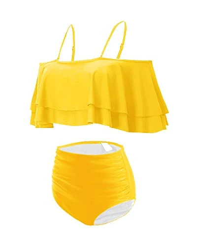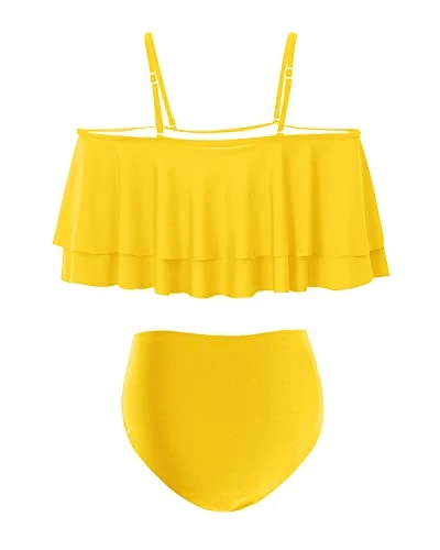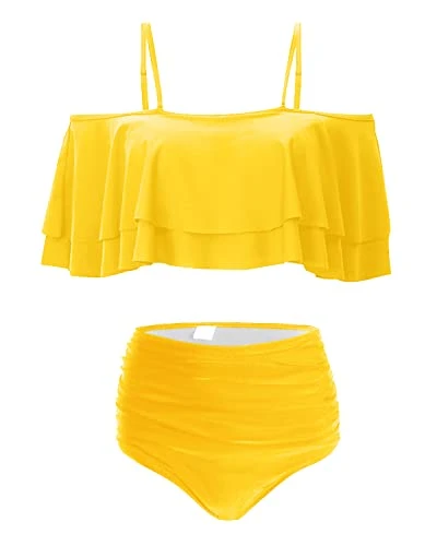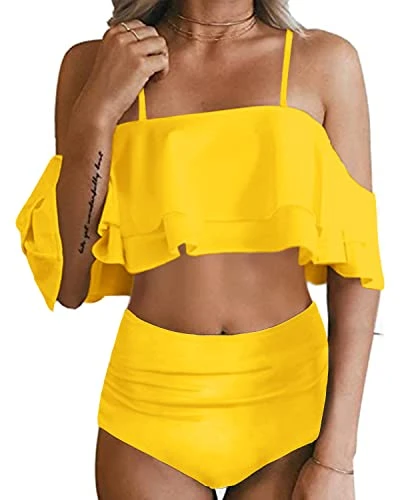 Be the center of attention at any pool or beach party with our 2 Piece High Waisted Ruffle Off Shoulder Bikini.