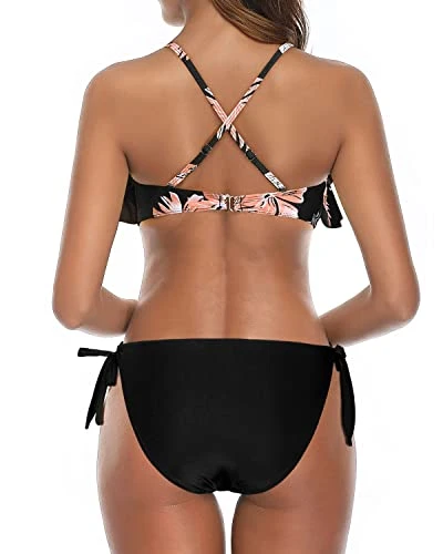 This two piece flounce bikini set with a cross back design and hook closure offers excellent support and a perfect fit, while its vibrant color and unique design will make you stand out on the beach.