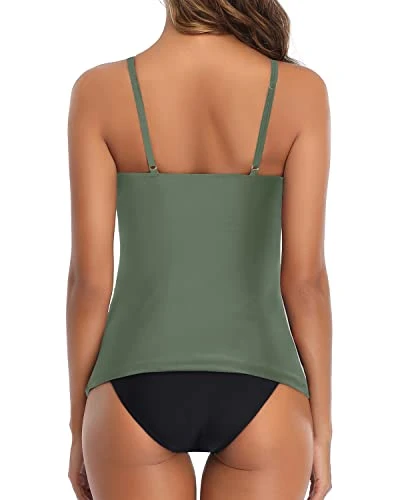 This two-piece high-neck tankini offers full coverage with an open back design and adjustable neck tunnel and straps. The ruched green top with floral or paisley prints hides imperfections, and the solid high-cut bottom accentuates curves.