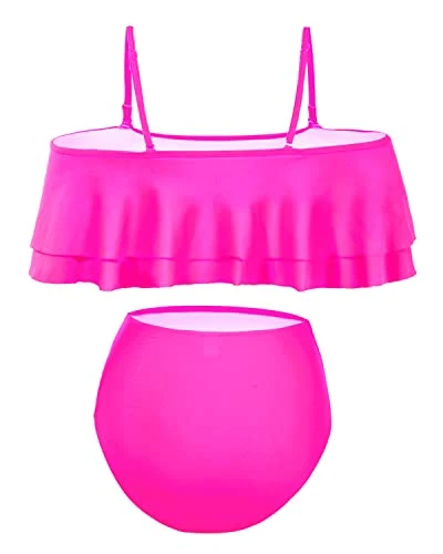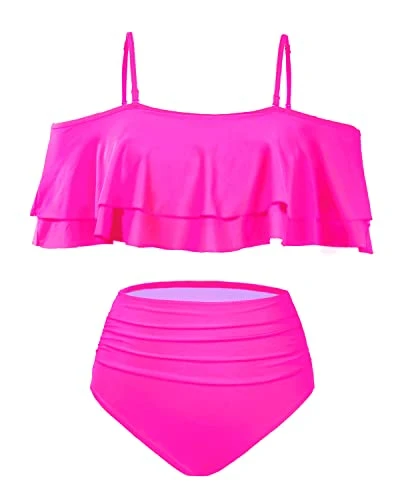 Stay confident and stylish with our fashionable 2 Piece Ruffle Off Shoulder Bikini Swimsuit, designed with tummy control bottoms.