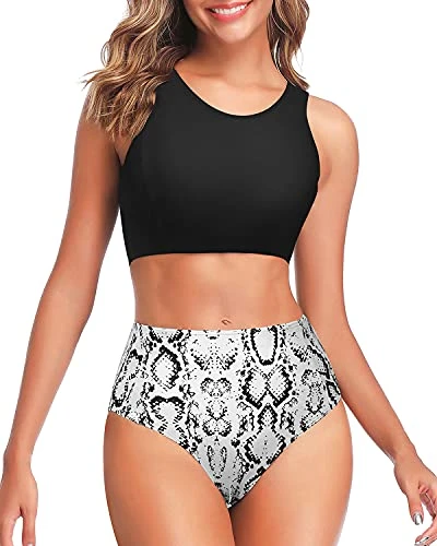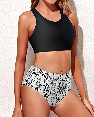 Get ready for your next beach adventure with our sporty two piece high waisted bikini set, featuring a scoop neck top and full coverage bottom with tummy control.