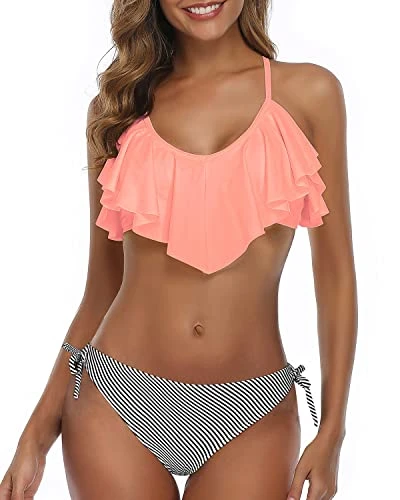 Two Side Ties Women Cross Back Bathing Suit-Coral Pink Stripe