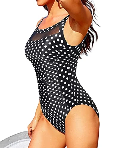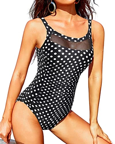 This vintage-inspired one-piece mesh swimsuit offers both shape and support with comfy wide shoulder straps and padded push-up bra, while the see-through mesh design and ruched tummy control offer a flattering and stylish look perfect for any beach or poolside activity.