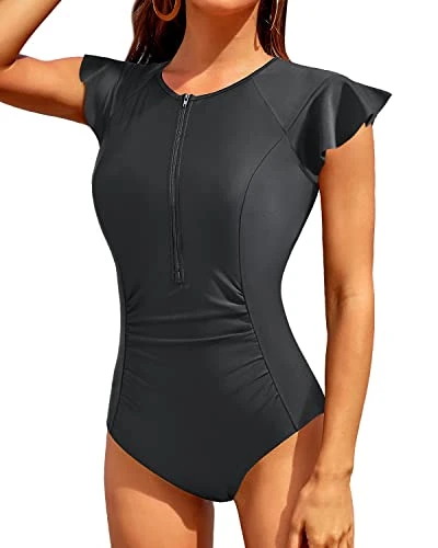 Women’s High Neck Short Sleeve One Piece Rash Guard-Black