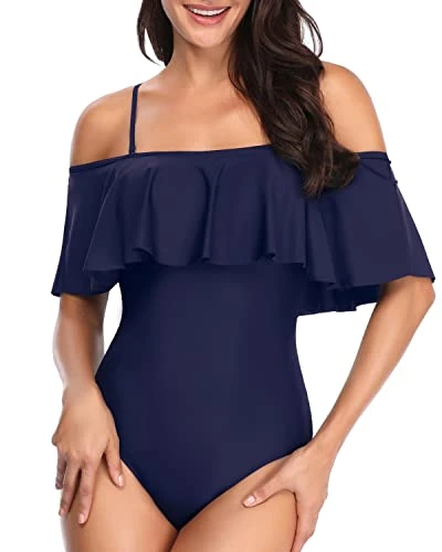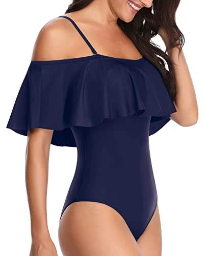 This vintage-inspired off shoulder swimsuit with ruffle detailing is perfect for any tropical getaway, offering a timeless and elegant look.