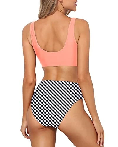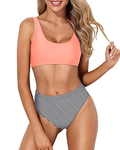 Whether you’re hitting the waves or soaking up the sun, this chic and comfortable scoop neck sporty high waisted bikini set is the perfect choice for any beach day.