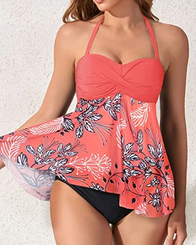 Feel confident and comfortable in this halter bandeau tankini with a flowy flyaway design, tummy control, and matching mid-rise bottoms.