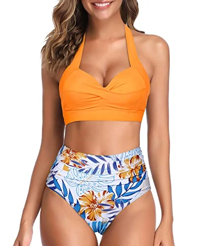 Women’s Two Piece Highwaist Bikini Bathing Suit Figure-Flattering Pleated Front Panel-Yellow Floral