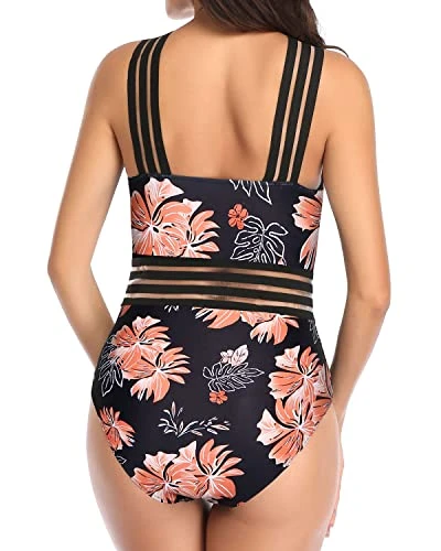 Women Sexy Crisscross One Piece Front Crossover Swimwear-Black Orange Floral