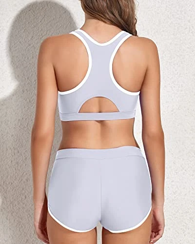 Women Sporty Racerback Crop Top Shorts Bathing Suits-Light Gray