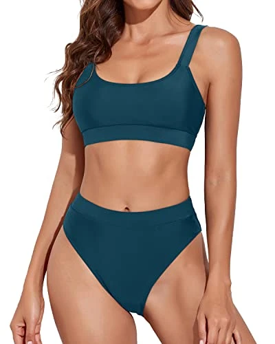 The sporty scoop neck bikini tops with adjustable shoulder straps and removable padded bra provide good support.The high rise athletic bathing suit bottoms perform well in tummy control. High cut and cheeky design can show your charming body curves.